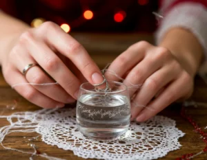 Для проведения данного ритуала необходимы вода, стакан и обручальное кольцо. Украшение девушки брали у родственников или замужних подруг. Именно через обручальное кольцо нужно было продеть свой волос. В момент, когда украшение начинало раскачиваться, предсказательница считала удары о стенки. В результате она узнавала, сколько лет оставалось до замужества.