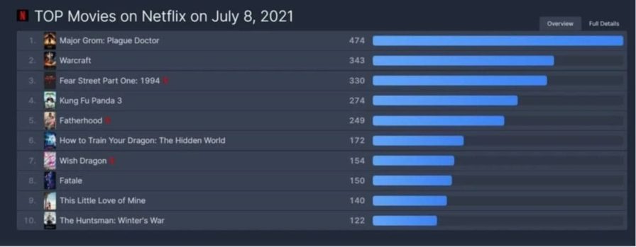 Российская картина «Майор Гром: Чумной Доктор» за сутки после выхода на западные рынки – на платформу хостинга Netflix – добилась лидерских позиций. Об этом сообщают статистические данные площадки.
