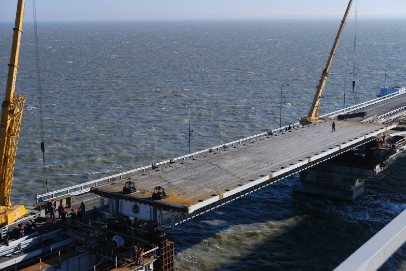 Вице-премьер РФ Марат Хуснуллин в своем Telegram-канале сообщил о завершении установки первого пролета левой автомобильной части Крымского моста.