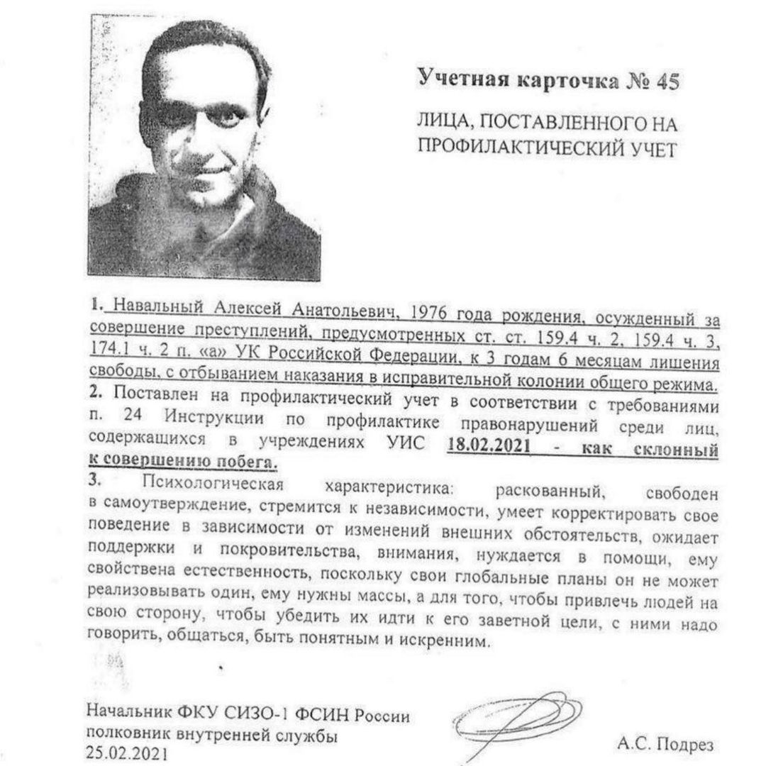 Оппозиционный блогер Алексей Навальный опубликовал в своем аккаунте в Instagram фото, учетную карточку и ориентировку на случай побега, составленную на него тюремными психологами.