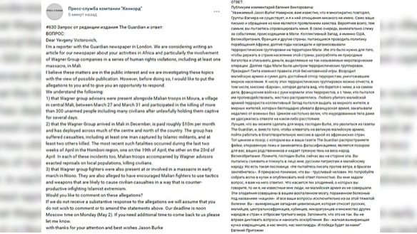 Пригожин напомнил британскому журналисту, что «ЧВК Вагнера» не существует. Бизнесмен также подчеркнул, что не имеет какого-либо отношения в этой группе. Он назвал само обращение проявлением хамства и попыткой провоцировать. При этом Пригожин отметил, что следит за событиями в Мали.