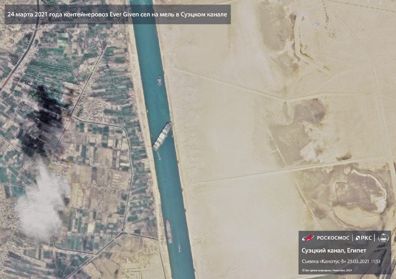 Глава Роскосмоса Дмитрий Рогозин опубликовал в своем Telegram-канале фото из космоса ситуации в Суэцком канале, где сел на мель контейнеровоз, полностью заблокировав проход для других суден.