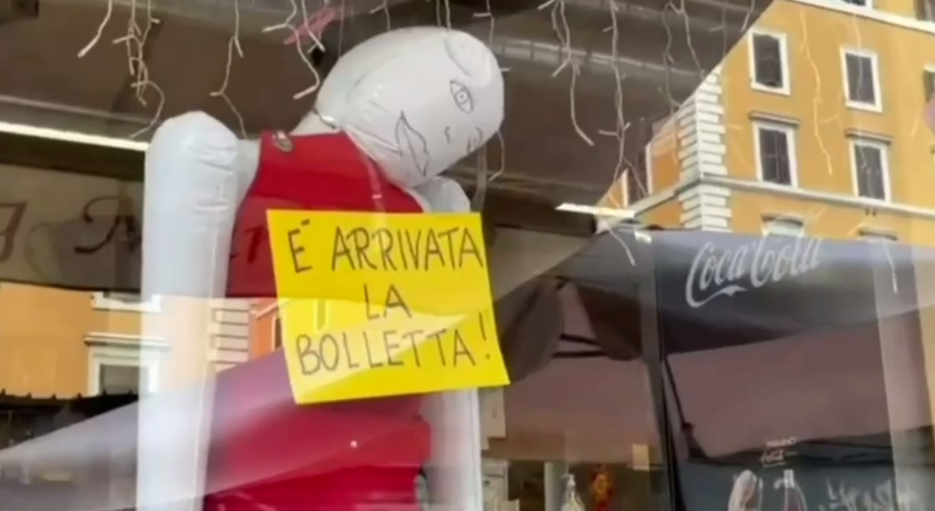 «Креатив от итальянских предпринимателей. В витринах магазинов в Риме стали появляться «повешенные» надувные куклы с табличкой на груди «Счет на коммуналку пришел», — рассказал телеведущий.