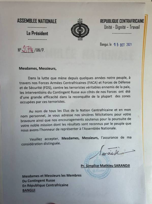 В парламенте Центральноафриканской Республики состоялась церемония награждения главы российских инструкторов Александра Иванова. Документ с благодарностью лично вручил спикер Национальной ассамблеи Симплис Матье Саранджи.
