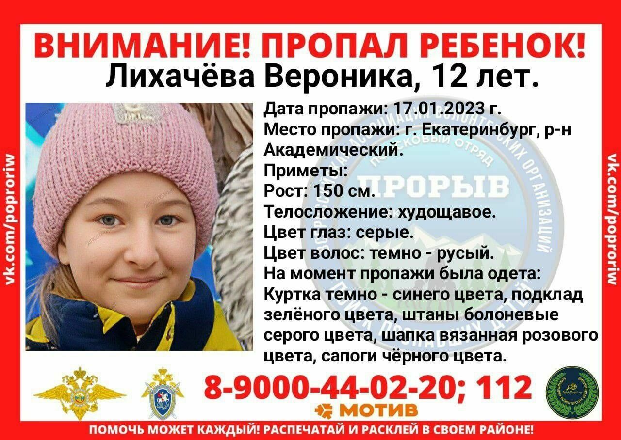 В Академическом районе Екатеринбурга пропала 12-летняя Вероника Лихачева. Она ушла на занятия во вторую смену в школу, однако обратно к родителям не вернулась. Об этом сообщает tagilcity.ru со ссылкой на поисковый отряд «Прорыв».