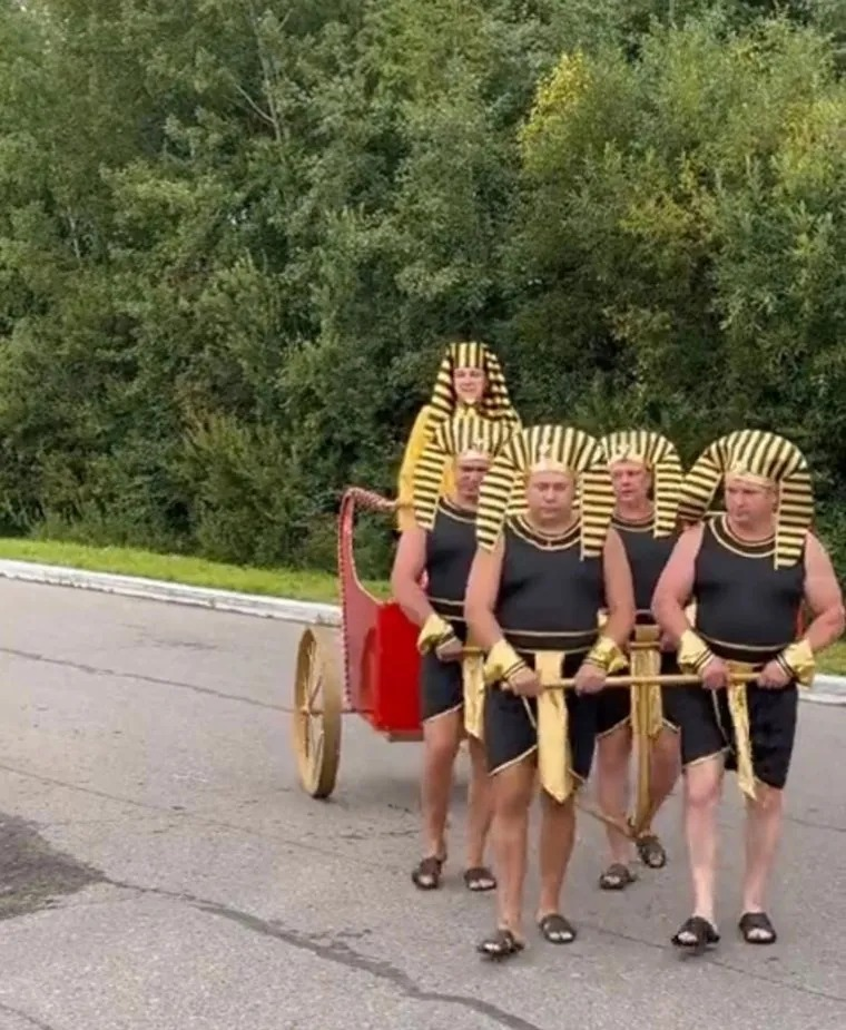 «Ярославский бизнесмен оделся фараоном и запряг людей в колесницу», — пишет издание 360.ru.