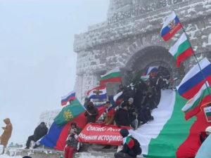 На снимке местные жители стоят около здания с российскими флагами и лозунгами. Фотографию он сопроводил короткой фразой: «Болгария: «Спасибо, Россия».