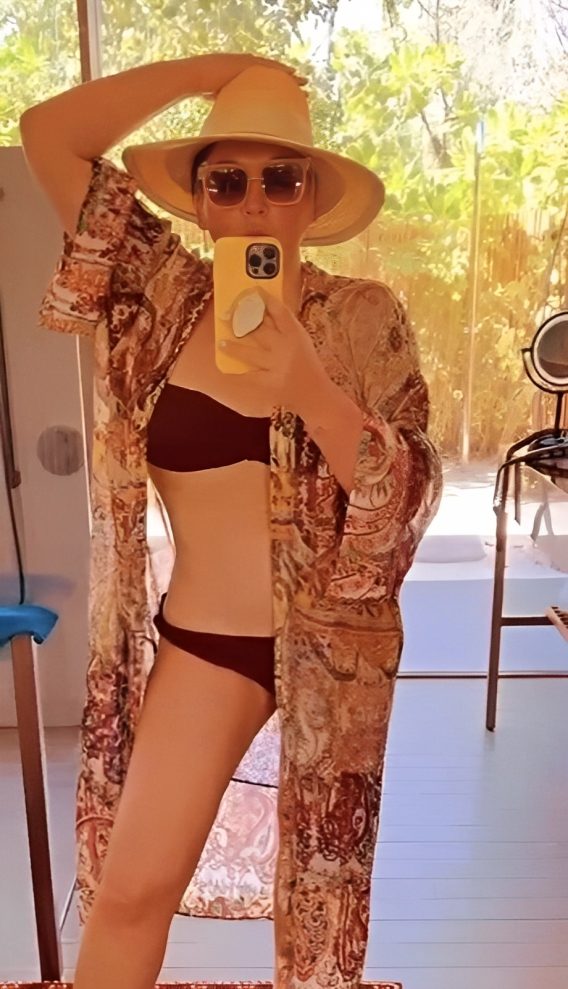 41-летняя знаменитость опубликовала снимки с отдыха на Мальдивах, на которых она позирует в отеле перед зеркалом в бикини и халате.
