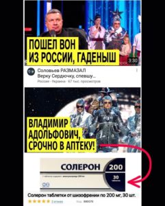 Более того, сразу под видео у Данилко высветилась реклама препарата от шизофрении. Артист посчитал, что это знак, и пошутил, что Соловьеву стоит сходить в аптеку.
