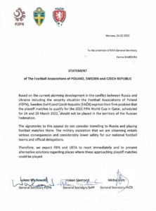 Совместное официальное заявление национальных футбольных федераций Польши, Чехии и Швеции поступило в Международную федерацию футбола (ФИФА) с призывом провести стыковые матчи чемпионата мира-2022 не в России. Напомним, что поляки стали соперником российской команды в полуфинале «стыков», а шведы или чехи сыграют с победителем пары. Если им станет Россия, то игра так же пройдет в Москве.