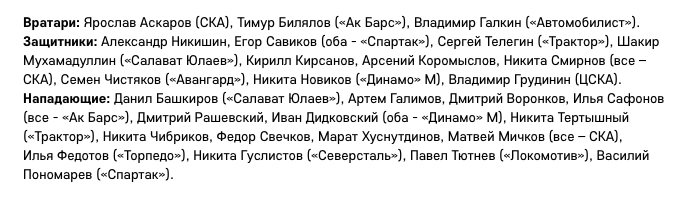 Полностью состав сборной России на Кубок Карьяла выглядит следующим образом: