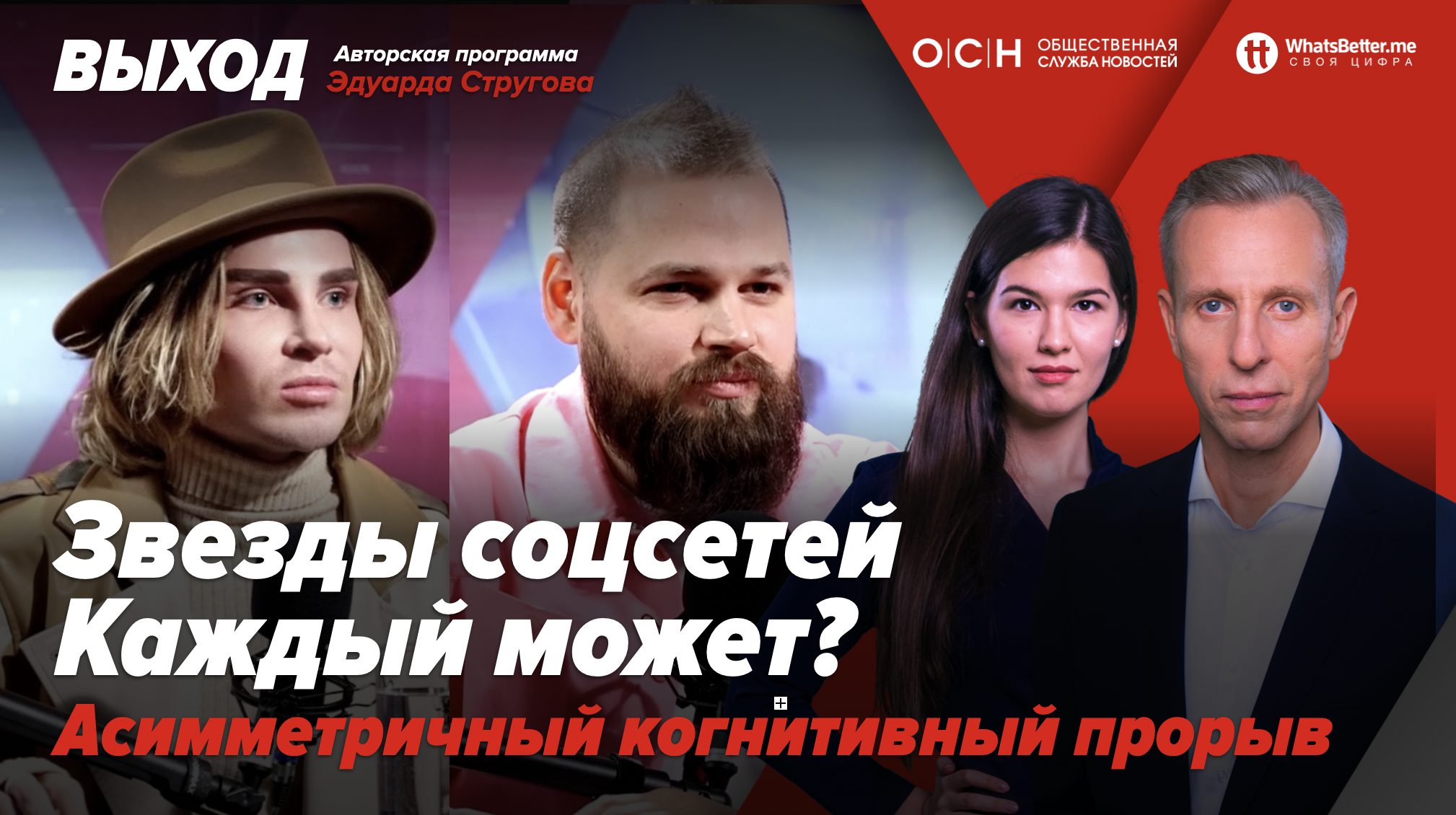 Авторская программа Эдуарда Стругова “Выход” – первая и единственная программа, в которой мы собираем сообщество, вместе меняем правила и создаем справедливый мир, где каждый получит больше, Россия станет одним из глобальных лидеров, а человечество избежит гибели и совершит самый мощный скачок развития.