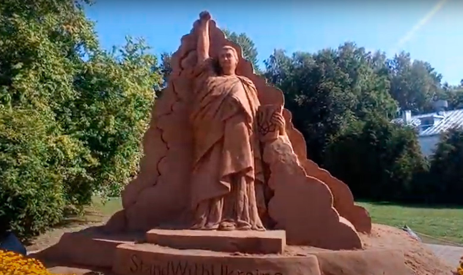 Эта памятная скульптура появилась в Эстонии в феврале. На ней изображен Зеленский в образе статуи свободы, но без факела, а с сжатым кулаком. В левой руке президента изображен щит с трезубцем.
