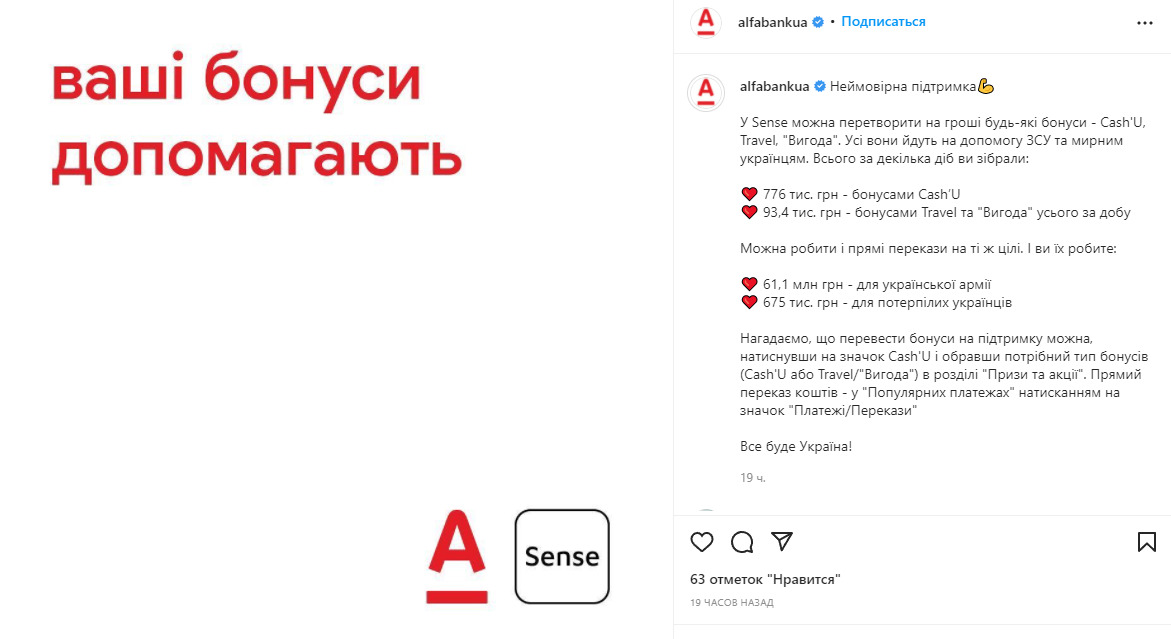 «Всего за несколько суток вы собрали: 776 тыс. гривен – бонусами Cash’U, 93,4 тыс. гривен – бонусами Travel и “Выгода”. Можно делать и прямые переводы на те же цели. И вы их делаете: 61,1 млн гривен – для украинской армии, 675 тыс. гривен – для потерпевших украинцев».