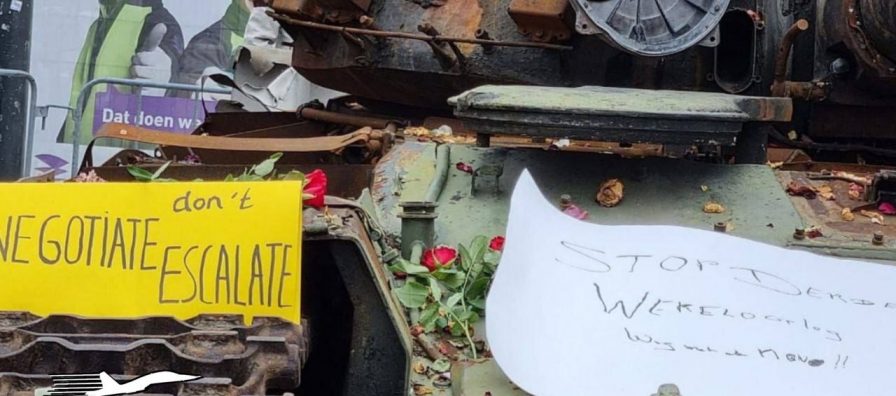 В Амстердаме подбитый на Украине российский танк осыпали цветами